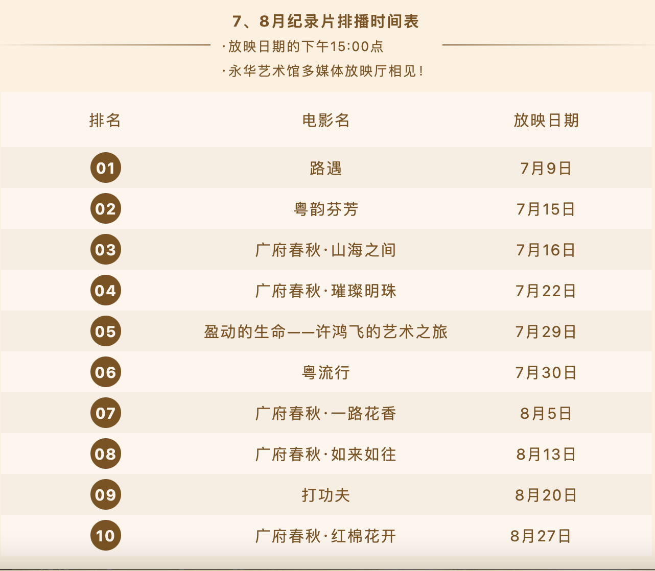 2022年永华艺术馆藏书阁与广州图书馆共建“中国家具文化主题分馆”,为共同推广中华文化、非遗文化、广府文化,依托广州图书馆纪录片中心的影像资源,2023年7月至8月暑期,永华艺术馆将举行“暑期纪录片放映活动”,免费为市民朋友们放映优秀纪录片,期望大家更加了解我们的城市文化,更加热爱这片土地!