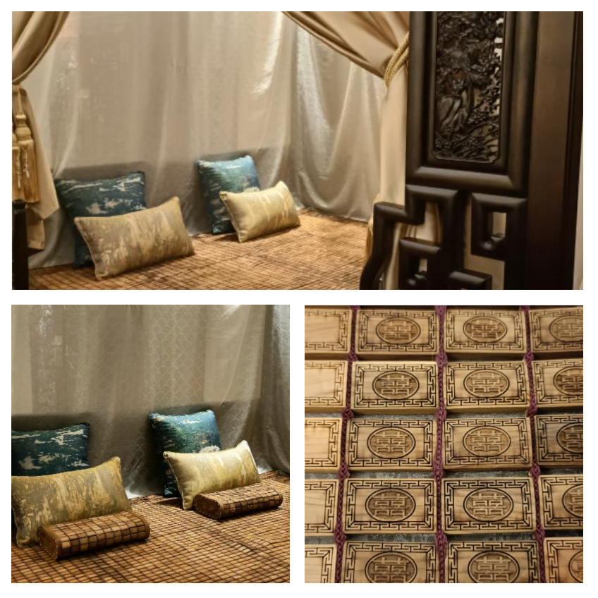 此款麻将凉席以Taxus spp为材,良好的亲肤性与透气性一颗一颗的麻将排兵布阵,如同牌匾一样。每一块籽片都带有少许雕刻,外围三圈则带有双喜纹饰,使得整件凉席更为精致,却又不影响卧躺时的舒适性,是夏秋高温之际防暑降温的佳品。