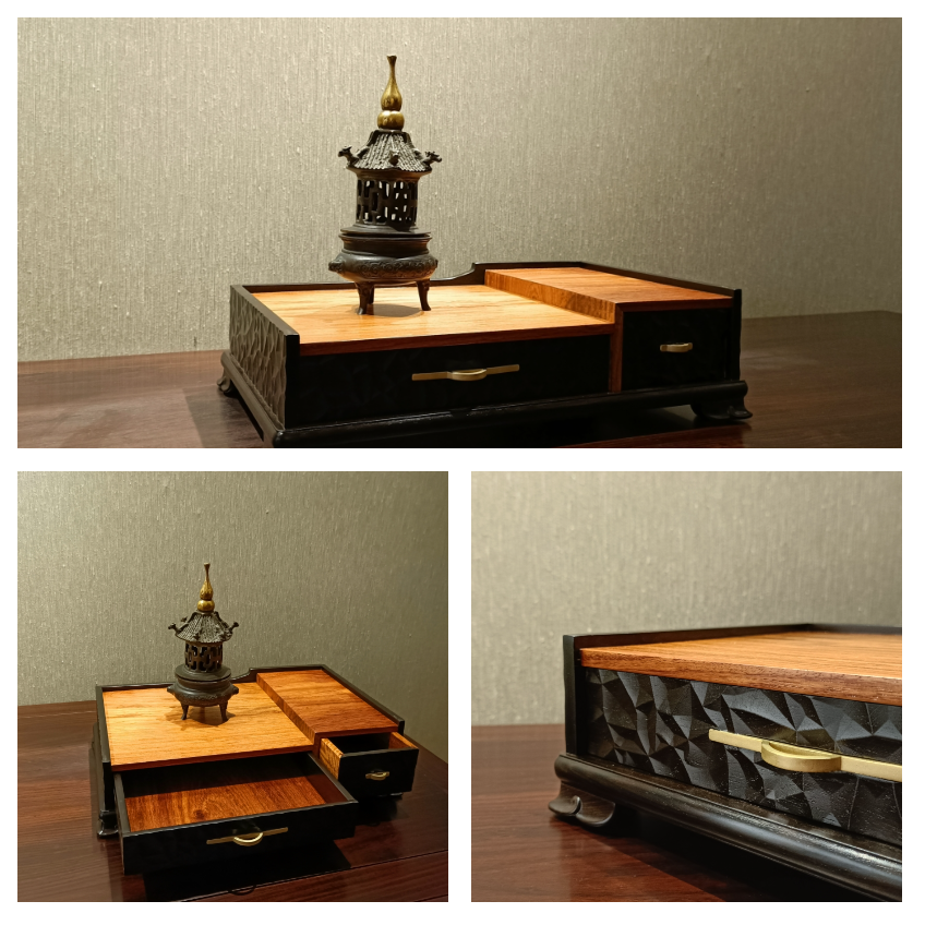 此款收纳盒以缅甸花梨和紫光檀为材,是明亮与沉稳的碰撞。设深浅两具抽屉,其上设黄铜拉手,方便拿取器物。四周面板挖雕成冰裂纹状,颇具匠心与设计感,上方平滑,既可用于陈设香炉、花瓶等器物,也可放置其他小物件,实用性较强。