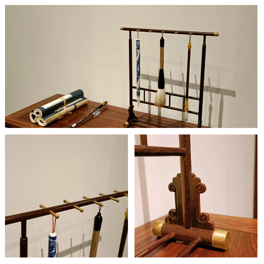 此款笔挂以小叶紫檀为材,上设十针,可倒悬笔管,做晾笔之用。切面以黄铜包边,中部制成栏杆状,下设卷云纹角牙,底部由两根横枨相连,使笔挂更为稳固,既能增加视觉效果,亦可放置小物件,兼具实用性与观赏性。