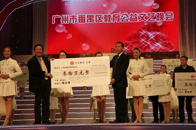 2011年1月18日晚,广州市番禺区“上品教化,和谐番禺”教育公益文艺晚会在英东体育馆隆重举行。广东省政府教育督导室主任陈健,广州市教育局局长华同旭,全国政协委员、香港立法会议员、广州市荣誉市民霍震霆;区委书记、区人大常委会主任谭应华等有关单位的领导,捐款单位和个人代表等1500余人参加了晚会。