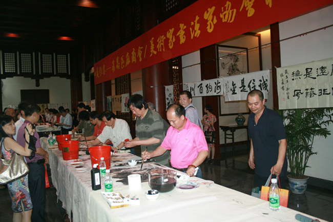 联谊活动上,区美术家书法家协会主席何穗鸿围绕其书法作品“风水好人”展开了一场书画艺术的欣赏及风水作用的演讲。他说,书画艺术品应该具备两重性:一是带有政治及宗教色彩,为社会服务的社会性;一是带有吉祥色彩,为生活服务的生活性。何主席的书法长卷,篆、隶、楷、行、草五体兼备,表达了何穗鸿对书画界大团结、大繁荣、大发展的共同心声,也表达了对关心支持书画事业发展的各界人士的衷心谢意。在曼妙的古筝声中,书画家们现场即席泼墨,让到场的企业家们大开眼界。晚宴交流会上,大家就书画作品的品鉴发表了自己的看法,其中,南村商会会长王锦荣以“近文者雅”、“近智者慧”、“近翰墨者豪”、“近丹青者多彩”等为主题阐述了人与人、人与文化以及人与艺术之间相得益彰的精彩论断。