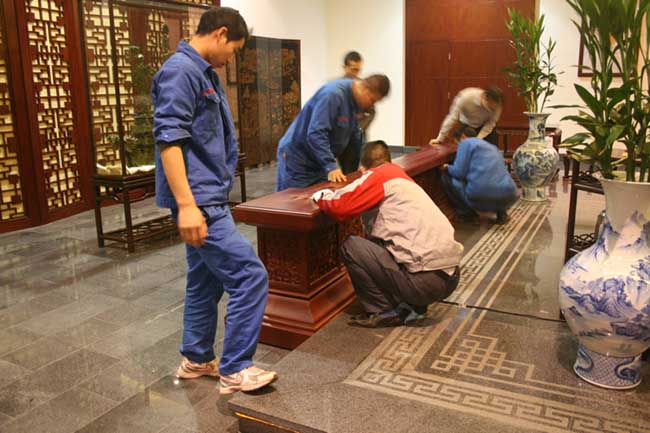 售服部,他们当中多数是80后的主力,也有90后新生。这个融80、90后于一体的团队搬运和维修是他们的主要工作,跟着公司货车将包装好的产品安置到客人家中是他们每一天要做的事情。红木家具属实木家具,动辄百斤,须好几个人通力协作才能搬得动。当然,客户住区内有电梯乘坐那自然是方便省时,但若没有升降梯,即便是20层高楼,那也只能手搬肩扛沿楼梯一步步前行,如此一趟下来得耗费上半个小时甚至一个多小时的时间。如果是盛夏,更是举步维艰,为了避免搬运过程中家具上生出刮痕,几个人像工蚁般在狭窄的楼梯间里小心翼翼地挪动。累了,短暂歇息一会儿喘口气积蓄力量再向前,就这样走走停停,滴落在楼梯上的汗水似乎在印证着他们走过的足迹。到了客户家门口,借着喘气放松绷紧的神经之余,随手拿出携带在身上的毛巾将身上的汗渍擦干净,把笑脸、真诚留给客户似乎成为了他们心底那份不言而喻的原则。不曾埋怨,累了,就停下来歇歇,闷了,就哼哼小曲解解愁。一路走来,挣扎过,彷徨过,却不曾退缩过。