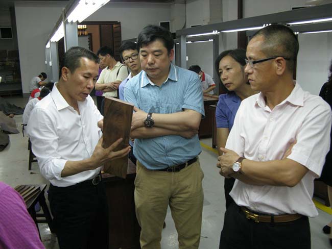 座谈会前,各位企业家在陈达强董事长的引领下参观了永华观光工艺走廊、刮花车间、雕花车间。在雕花车间,陈达强董事长现场拿起一块雕花样板,向嘉宾们介绍永华家具的雕花制作工艺。嘉宾们也饶有兴趣,一边观看,一边还就自身关心的问题和陈董及身边的人员探讨。