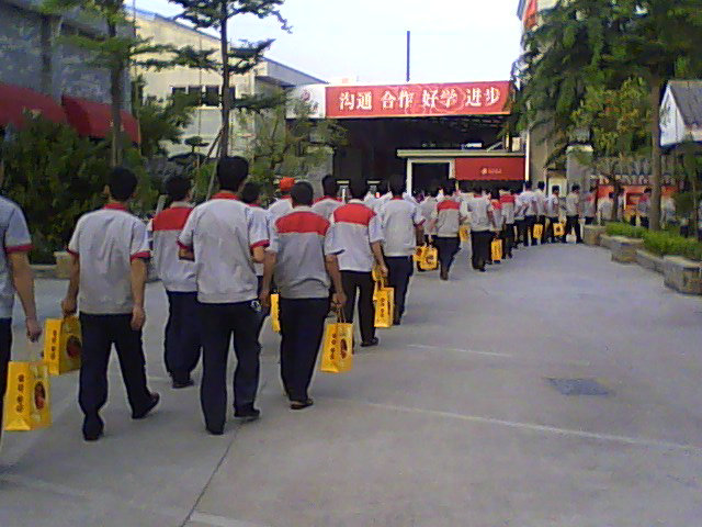 26日下午下班时分,在厂房到厂区出口的路上,形成了一道独特的风景:每名永华员工手里提着一盒月饼,迈着整齐而有序的步伐,脸上带着喜悦的笑容,完成了一天的工作带着轻松的心情走在下班的路上,而月饼的黄色包装盒在人群中显得特别的统一与耀眼。而就在当天,凡是在9月份生日的永华员工都收到了永华为他们准备的生日蛋糕,不少永华员工一手提着月饼,一手提着蛋糕。