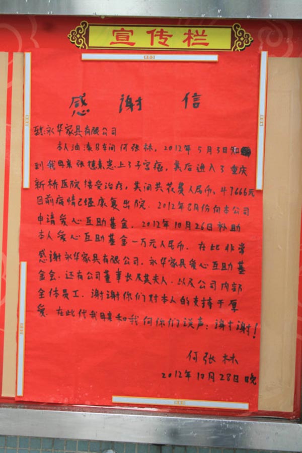 “感谢永华家具有限公司、永华家具爱心互助会,还有公司董事长及其夫人,以及公司内部全体员工,谢谢你们对本人的支持与厚爱,在此我和我的母亲向你们说声谢谢。”10月30日,一张红底黑字的大幅感谢信张贴在永华公司的宣传栏里,员工们纷纷驻足观看,写这封感谢信的是油漆B车间的永华员工何张林。对于永华爱心互助基金资助10000元帮助其母亲治病的善行,何张林在信中表达了对公司全体同仁的感谢之情。