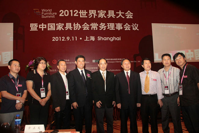9月11日,2012世界家具大会暨中国家具协会常务理事会议在上海浦东嘉里大酒店隆重举行。中国轻工业联合会会长步正发、中国家具协会理事长朱长岭以及中国家具协会领导出席了会议。会议由中国家具协会副理事长张冰冰主持。我协会刘显明会长、部分副会长以及秘书长陈允参加了会议。