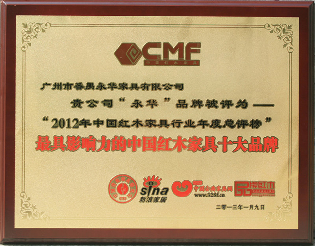 在中国红木家具行业年度总评榜官方网站、中国古典家具网、新浪家居等各大合作支持媒体上公示的获奖名单中,永华家具被评为“2012年最具影响力的中国红木家具十大品牌”,这是永华家具连续第三年获此殊荣。此外,永华家具董事长陈达强被评为“2012年中国红木家具行业突出贡献风云人物”,副总经理邱志坤被评为“2012中国红木家具行业杰出职业经理人”。