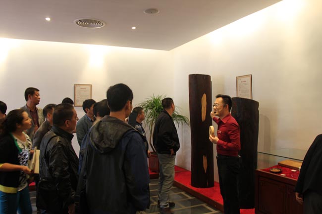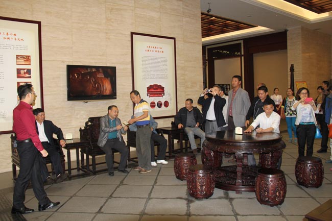 参观由永华商场的荣誉墙拉开了序幕,在荣誉奖牌的辉映下,原木展示区的木材更显光泽。“小叶紫檀的生长速度非常缓慢,成材需要八百到一千年……”杨经理的话引来了来宾的阵阵惊叹,杨经理还对红木家具的摆设、材质、文化等作了详细介绍,并邀请来宾进行试坐体验。不少来宾更是利用手机进行拍摄,将精彩的一刻记录留存。