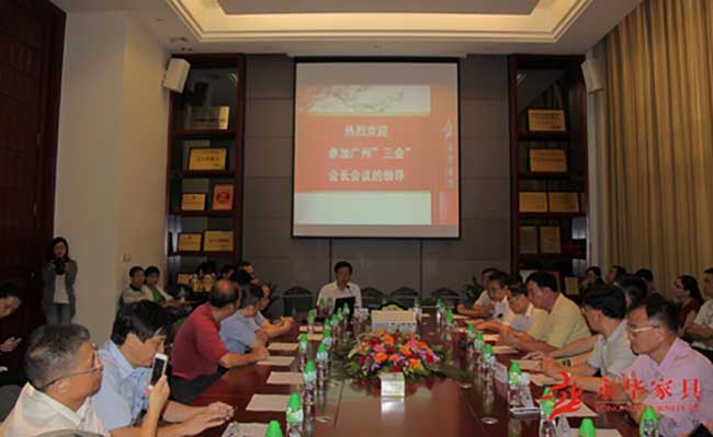 随后,在永华会议室顺利召开广州“三会”第四届理事会第一次会长会议,会议由“三会”副会长秘书长刘建民主持,通报“三会”近期的工作情况,并提出“三会”组织开展专项工作小组,由专家顾问陈权斌、曹城就、吴邦灿为小组工作成员,通过他们的监督与协助,以此提升行业协会的影响力。然后由永华红木家具副总经理邱志坤、销售经理杨军分别就永华红木家具发展的情况作介绍,传达了永华肩负“传承千年家具经典,创世纪家具文化”的经营使命,秉承精益求精的态度,传承经典,勇于创新,以实现“知木知永华”的品牌效应。