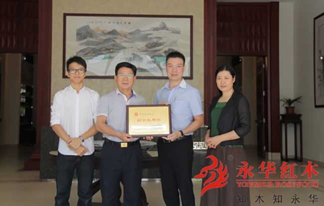 “三会”常务副会长曾元烽(左二)、永华红木家具副总经理邱志坤(右二) 董事长助理陈国伟(左一)、“三会”副秘书长于敏之(右一)合影留念 10月31日,广州工业经济联合会、广州市企业联合会、广州市企业家协会(以下简称“三会”)常务副会长曾元烽与副秘书长于敏之走进永华红木家具,由永华红木家具副总经理邱志坤、董事长助理陈国伟等热情接待。他们在这秋风送爽的日子,给永华带来了新的好消息——永华红木家具被选为“三会”第四届理事会副会长单位,副总经理邱志坤被聘请为理事会副会长。由“三会”常务副会长曾元烽代表“三会”向永华红木家具副总经理邱志坤授牌,并颁发聘书。这一荣誉,是“三会”对永华红木家具的高度赞赏与肯定,也将鞭策着永华红木家具向更高的目标迈进。