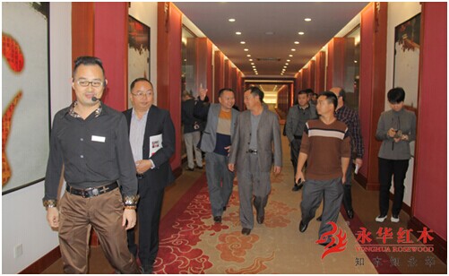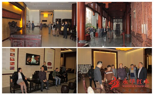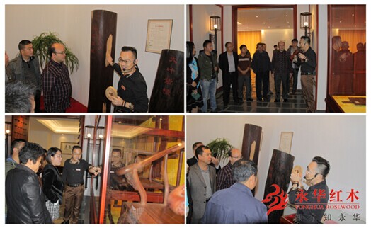 走进永华观光工艺走廊,杨经理向众来宾引见了小叶紫檀、海南黄花梨、老挝大红酸枝等高端原木材,并介绍了各木材的基本特质、成材:“百年酸枝,千年紫檀”之解说,更是让来宾心领神会;讲解了关于“红木家具白皮与心材的区别”、“榫卯结构中单双榫的陷阱”、“红木家具用料多与寡对家具价格的影响”等红木专业知识和购买陷阱等话题。杨经理通过用生动的实物演示和详细的理论讲解相结合的方式,让来宾迅速快捷、兴趣盎然地了解到这些重要的红木家具收藏购买知识。