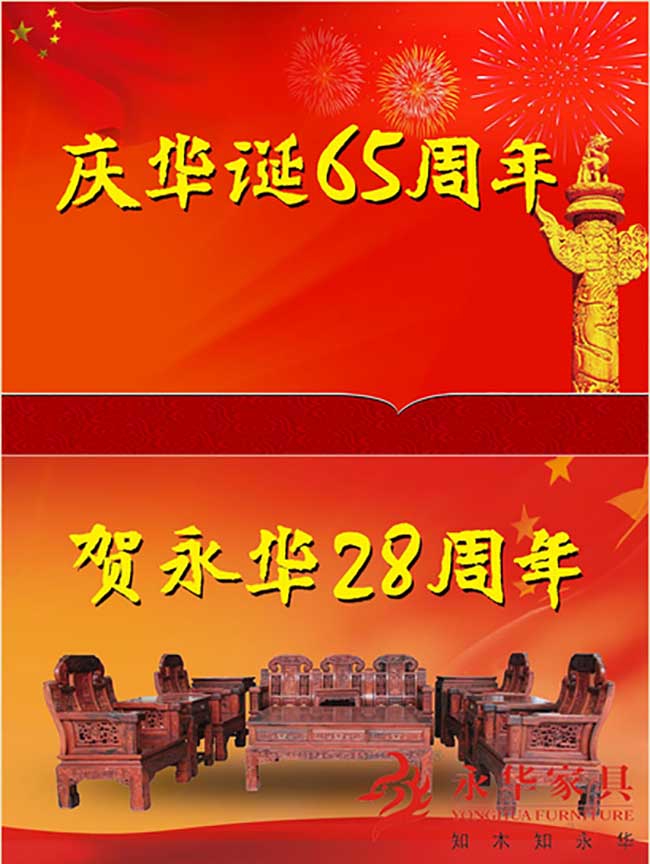 为了喜迎中华人民共和国成立65周年,恭贺广州市番禺永华红木家具28周年。感谢各位新老客户一直以来的支持与厚爱,永华红木家具国庆期间特推出全场高端红木家具尊享超值折上折优惠,更多火爆惊喜诚邀您入店参观选购。