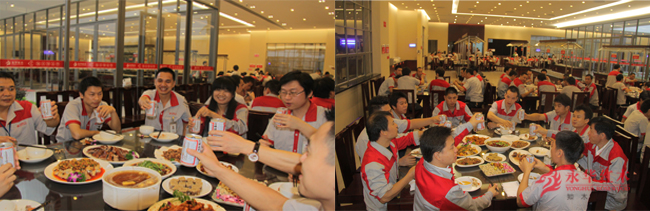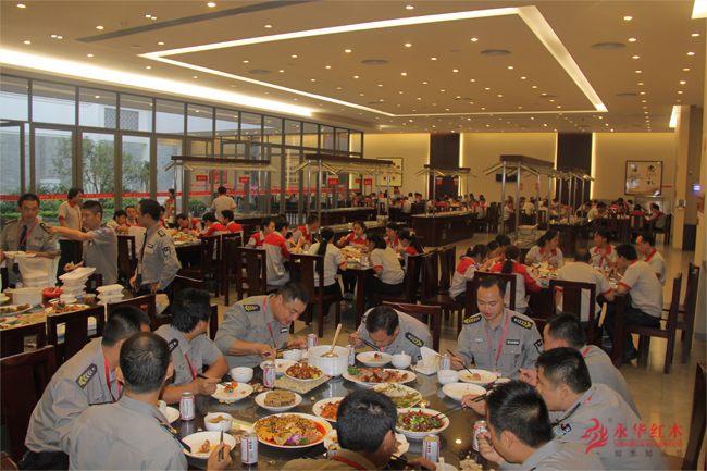 来到“凤鸣阁”,不一会功夫已是大排“长龙”,而我则是长龙摆尾,此刻,我才深深理解中国人自称为“龙的传人”的真正涵义。永华餐厅的环境和设施布局让我耳目一新:首先是一排田园式小竹子给人一种很清新惬意的感觉,然后透过玻璃门,每当抬头,总是不时会看到阿姨在向你示好,推门而入环顾一圈顿时感觉高大上,宽敞明亮的玻璃门气势如虹,整齐划一的红木桌椅高端典雅,干净通透的地板亮洁如新,粉刷一新的墙面一尘不染…所有这些,深深地迎合了陈董对永华餐厅的初衷和定位:给员工如家般的温馨和宾至如归的感觉,通过每一个永华人的努力和热情,将“凤鸣阁”打造成真正高大上的永华“自家”餐厅。