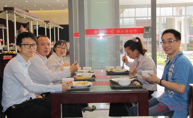 晌午时分,着红灰相间统一衣着的永华人迈着矫健的步伐来到永华餐厅,依稀听到车间的员工讲,“要给我们准备一台电子称,我感觉一进入餐厅食欲大增,要称一下体重,如果胖了就要减肥了,这时另外一名员工讲,减就不要减了,体重增加说明超量吃了,乐捐给吃不胖的同事加补”,有这样的说法吗?一片欢呼声……“陈课长这水果上面有青虫,还是活的呢”,附合声响起……“报告保安同志,我不小心将汤匙打碎了”,“李同志请将你的凳子归位……”,“你皮肤都那么好了,还吃这么多猪脚,让给我吗?看我一副缺营养的样子”……看着乐不思蜀的同伴们,洋溢着幸福的微笑……