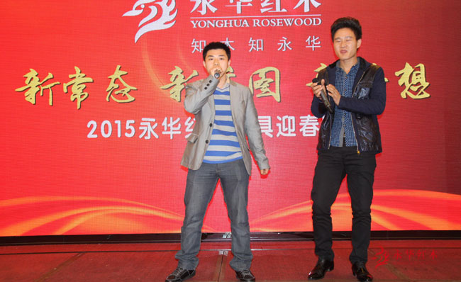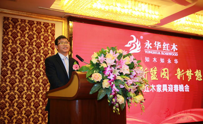 晚上7点整,“新常态•新蓝图•新梦想”2015迎春晚会正式开始,首先,由永华红木家具总经理赖荣达对来宾的到来表示热烈的欢迎并送上新年祝福。广州家具协会会长刘显明就永华红木家具2014年所取得的成绩表示祝贺,并对永华长期以来关心和支持协会发展表示感谢。同时也祝愿永华的明天更加美好。永华红木家具董事长陈达强致辞并表示面对目前的经济形势,永华人沉着应对,锐意创新,实现了品牌竞争力和经济效益的提升,并与永华高层领导一同祝酒,提前祝愿嘉宾和员工2015更美好。