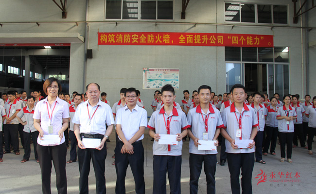 2015年6月19日早晨,在永华员工激情澎湃的唱完厂歌后,永华红木家具举行了本年度首次创新提案颁奖活动。永华红木家具总经理赖荣达为获奖部门和员工颁发奖金,并合影留念。