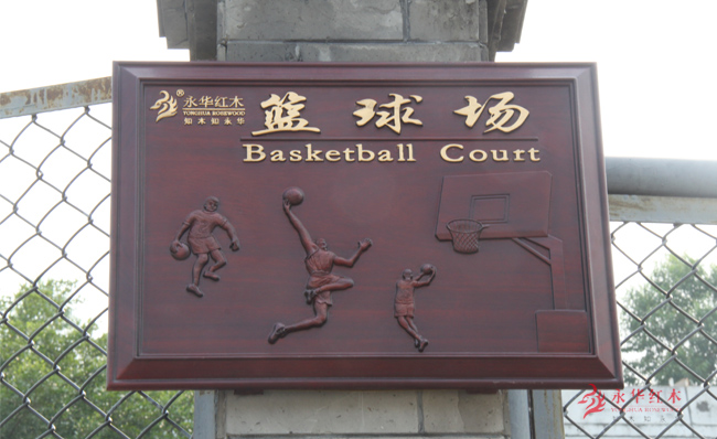 独一无二的红木篮球场标识牌给比赛现场增添不少色彩