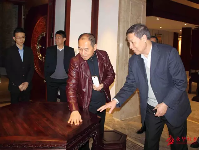 中国家具协会副理事长刘金良(右一)仔细探索研究红木家具的纹理