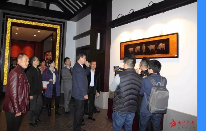 虽然下着绵绵细雨,但来宾们参观的热情高涨。步入永华艺术馆,来宾们对雄伟庄严的建筑,多功能企业文化体验区、舒适高雅的软装设计,还有古香古色的红木家具赞不绝口。嘉宾们在董事长陈达强的热情邀请下来到多功能企业文化体验区,静静观赏企业宣传片,并同时感受艺术馆内每一处所展现的红木氛围,将红木家具的文化底蕴与艺术价值诠释得淋漓尽致。在二楼红木家具展示区,各类精品红木家具以其各自独特的造型、古雅风韵让来宾们由衷感叹。一幅五牛图吸引了各位来宾驻足观看,五牛图通过丝翎檀雕工艺把牛的眼睛和眼部皱纹雕刻得惟妙惟肖,表现出每个牛的思想都不一样,寓意兴旺发财,财源滚滚的美好象征。