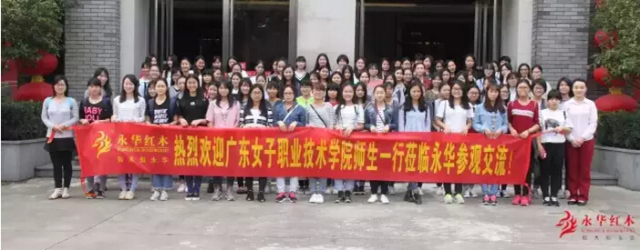 广东女子职业技术学院师生在永华红木家具展厅前合影留念
