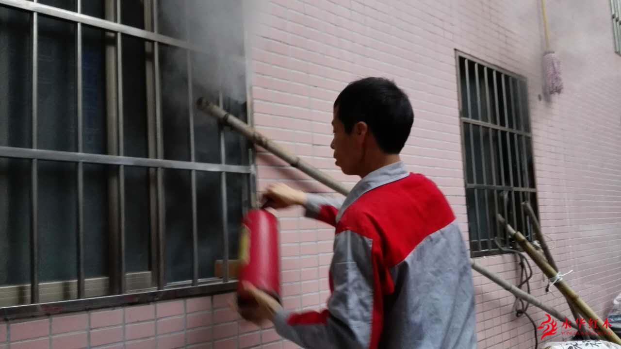 4月22日18点左右,永华红木家具员工周治宏、廖运青下班返回宿舍,看到我司2号宿舍楼隔壁一幢房屋一楼窗户冒出了浓浓的黑烟。周治宏立即向队长王自华报告火情,寻求支援。所谓“每临大事有静气”,二人并未因险情而手忙脚乱,而是抄起楼道里的灭火器,熟练地打开灭火器保险,对准房间窗户火源喷射,迅速扑灭了火势,阻止了火势的蔓延。由于楼房内空间比较狭小,杂物电器较多,若不是二人及时出手救险,后果不堪设想。