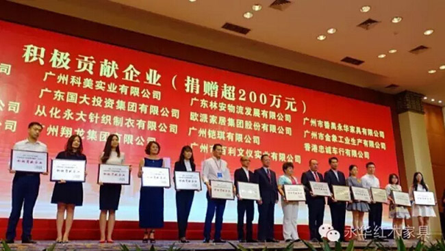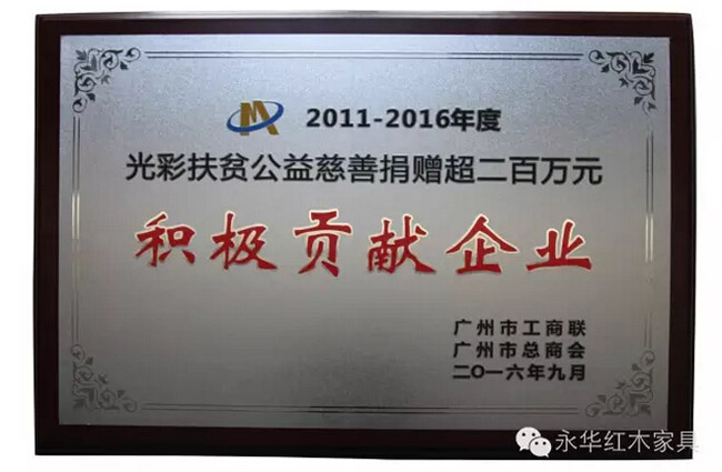 近五年来,永华红木在陈达强董事长的领导下,捐助了多个扶贫项目,善款超二百万元。本次永华红木荣获广州市“2011-2016年度光彩扶贫公益慈善”积极贡献企业奖,充分表明了各界对永华红木履行社会责任、服务广州经济发展和改善人们生活的认可,也充分肯定了永华红木对广州公益慈善事业作出的积极贡献。