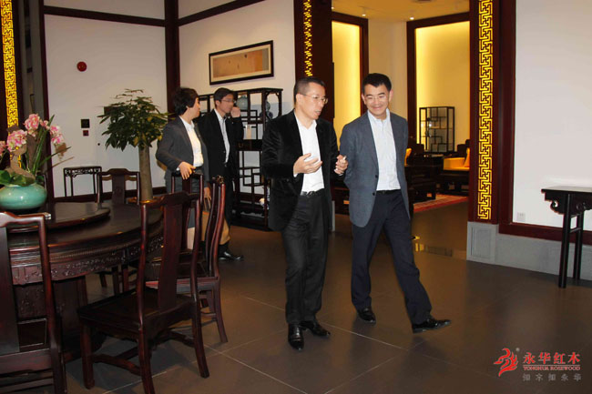 杨军经理向领导嘉宾们介绍具有浓厚艺术文化的红木家具