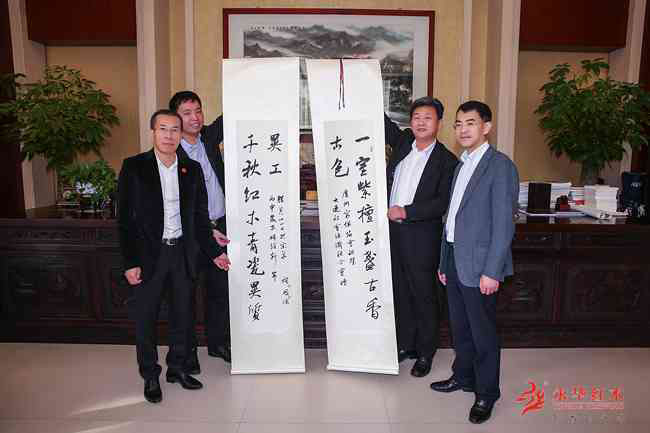大连市社会组织联合会会长杨福彬(右二)向广州市家具协会陈达强会长赠送知名书法作品