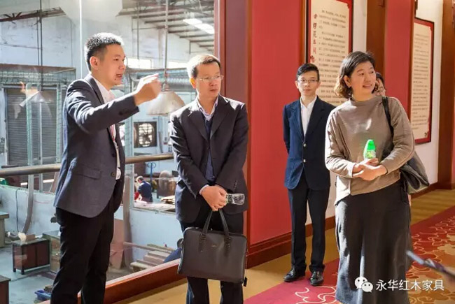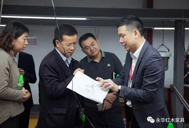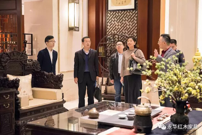 在永华艺术馆,调研组领导详细听取关于红木文化、红木雕刻、家具制作工艺的详细介绍,实地感受红木文化的博大精深及红木家具魅力所在。