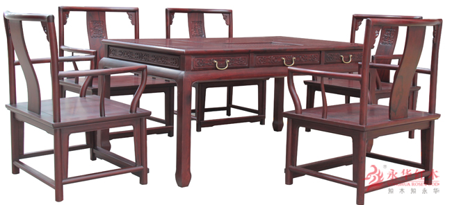 此茶台采用老挝酸枝制作而成,台面攒框镶板,边沿为混面,面下设抽屉,雕回纹,寓意子孙福禄连绵不绝,直腿内翻马蹄足。配官帽椅,椅座宽绰,靠背板呈“S”形,符合人体工程学。一套茶桌,是由五张椅子和一张主台组合而成,这五张椅子正代表五行的各方位,东方木、南方火、西方金、北方水、中央土。是感恩父亲的最佳首选。