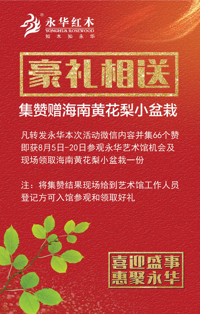 温馨提示:凡转发本文并集66个赞,前往永华艺术馆方可入馆参观并领取海南黄花梨盆栽一份。每人限领取一次,时间为8月5日——8月20日,大家抓紧时间哦!