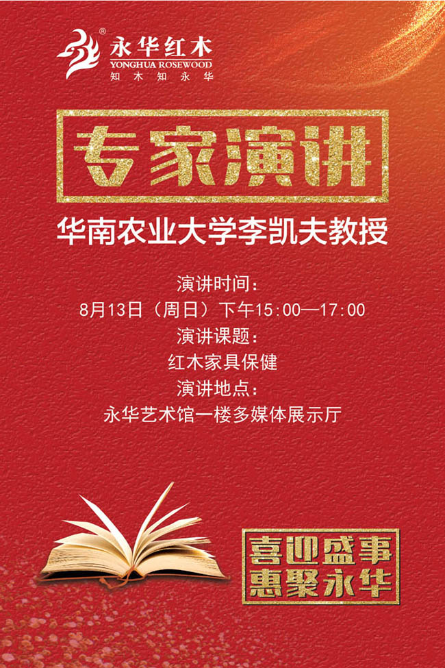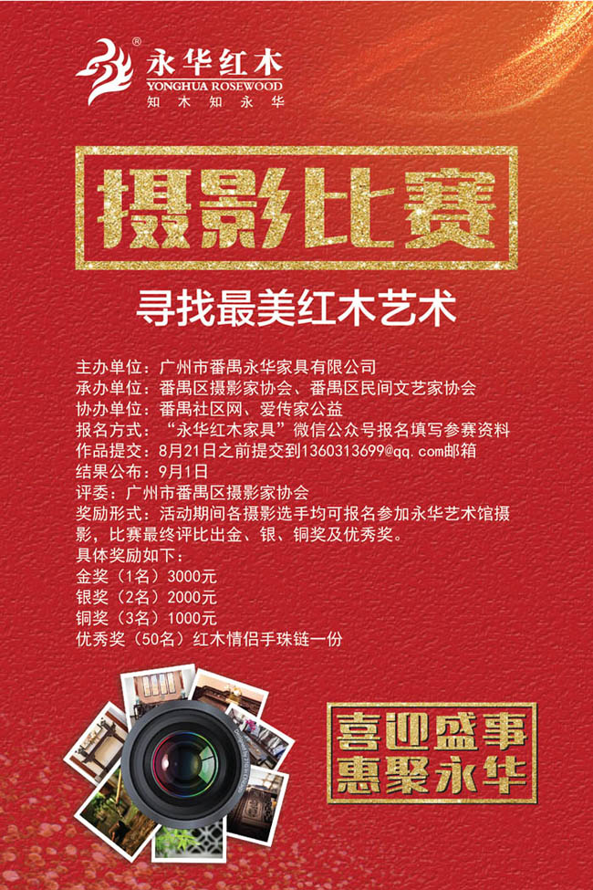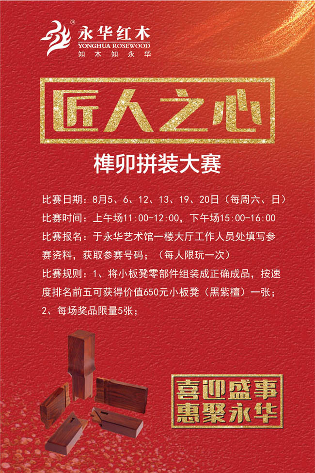 为预祝“全国家具(红木雕刻)职业技能竞赛广州番禺分赛”9月于永华艺术馆顺利举行;预祝“石碁红木文化小镇升级改造”成功;以及祝贺市级“广式硬木家具制作技艺(扩展项目)”申遗成功!在盛夏之际,永华红木于8月5日至8月20日举行以“喜迎盛事,惠聚永华”为主题的大型回馈活动。新老客户在永华艺术馆欢聚一堂,共同享受这热情的盛夏,充分感受永华红木的幸福魅力。