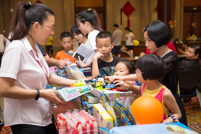 参与游戏后小朋友们兴高采烈领取礼品