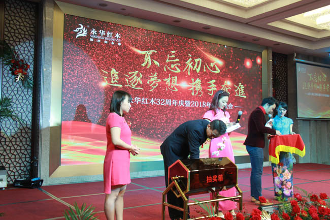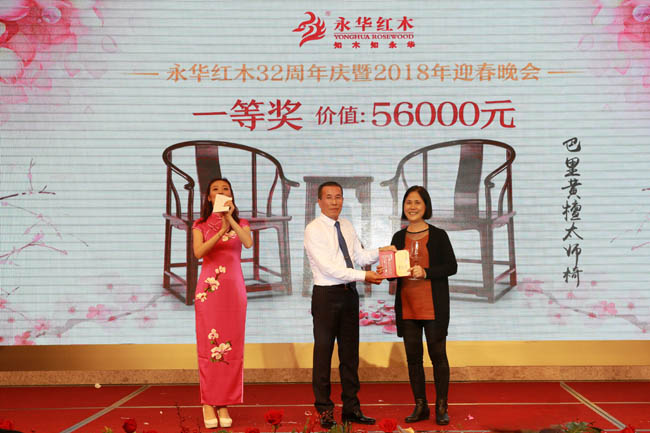 一年一度的永华大party最激动人心的莫过于精彩的抽奖环节,为了感谢嘉宾朋友及永华干部员工对永华公司一直以来的支持与陪伴,永华公司准备了丰厚的奖品回馈大家,除了几百个现金奖之外,另外还有巴里黄檀太师椅、交趾黄檀果盘、交趾黄檀茶盘等丰厚大奖,得到了现场来宾的雷动掌声。永华红木董事长陈达强先生在晚会上,连环加码送出超级大奖,让现场朋友们喜开颜笑,欢乐无比。