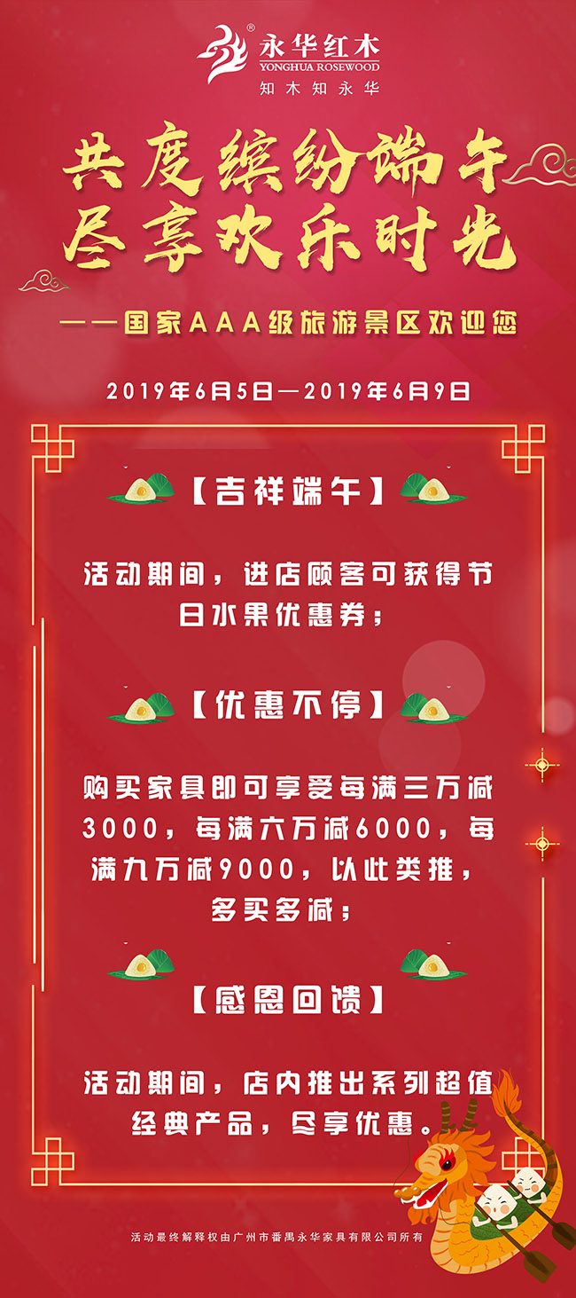 为热烈庆祝永华艺术馆被评为国家AAA级旅游景区,永华红木温情推出“共度缤纷端午·尽享欢乐时光”端午感恩回馈活动,诚邀您携伴同游永华艺术馆,探寻别具一格的中式情怀,度过一个与“粽”不同的端午假期。