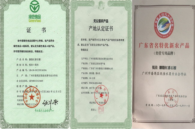 “胭脂红番石榴”获得国家绿色食品A级认证,其香甜软滑、香气四溢,果肉呈粉红色,内外三层各有三种不同的风味,口感独特,被评为广东省名牌产品、广东省名特优新农产品。