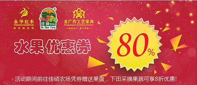 活动期间,买家具即享每满三万减3000、每满六万减6000,以此类推,多买多减;更有超值经典产品任您挑选,端午活动期间进店顾客均可获得节日水果优惠券,凭券前往番禺佳硕农场即可获得免费果盘,下田采摘水果更可享受8折优惠。