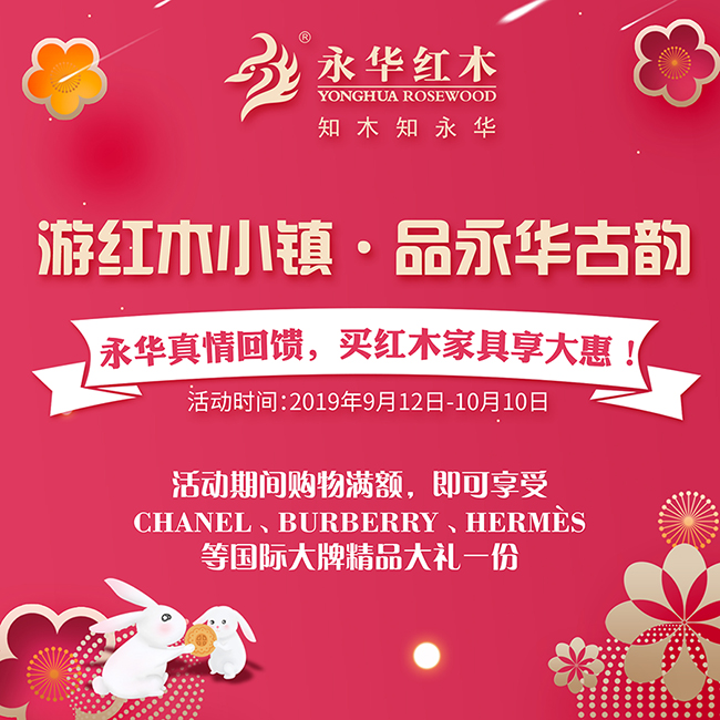 为热烈祝贺番禺红木小镇一期建设,值金秋华诞之际,永华红木真情回馈,于2019年9月12日-10月10日倾情推出“游红木小镇,品永华古韵”大型节庆优惠活动。