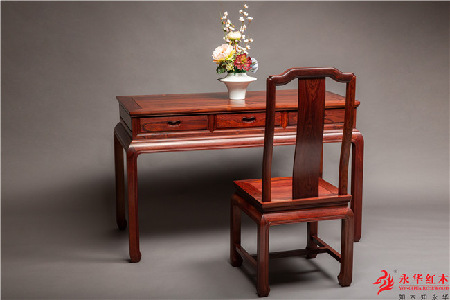 此套书台为酸枝所制,台面攒框镶板,面下设三具抽屉,内翻马蹄足。整体造型光素雅洁,木纹精美流畅,色泽清丽淡雅。置于居室,坐拥淡淡书香韵,细品幽幽明清风。