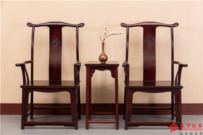 此四出头官帽椅由酸枝制成,椅面攒框镶板,搭脑和扶手两端均出头,椅背、扶手、连帮棍成“S”型,造型简洁优雅,符合明代文人“简约、神逸、天然、幽雅”的审美观。工艺娴熟,光素雅洁,散发浓浓书卷气。