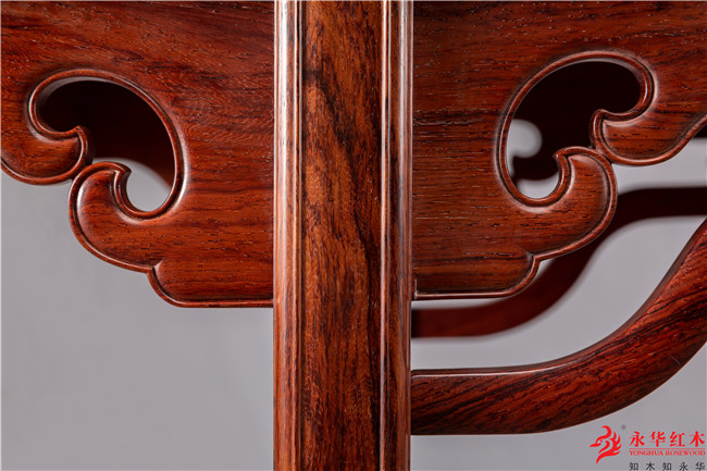 在腿肩左右的牙条上个透雕卷云一朵,圆转简洁,生动有力。其妙处在卷云稍稍向内倾仄,而云下牙子上的小小钩尖也起重要的作用。如果将卷云摆得端端正正,或将尖钩省略,随圆转去,效果就会大大减色。