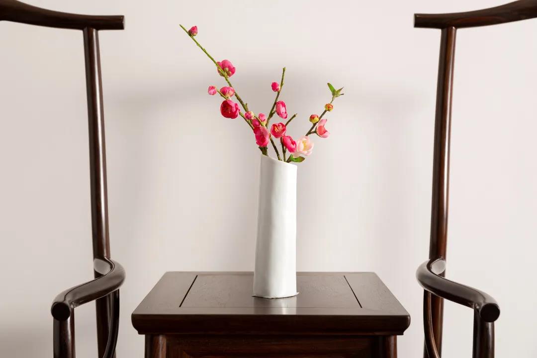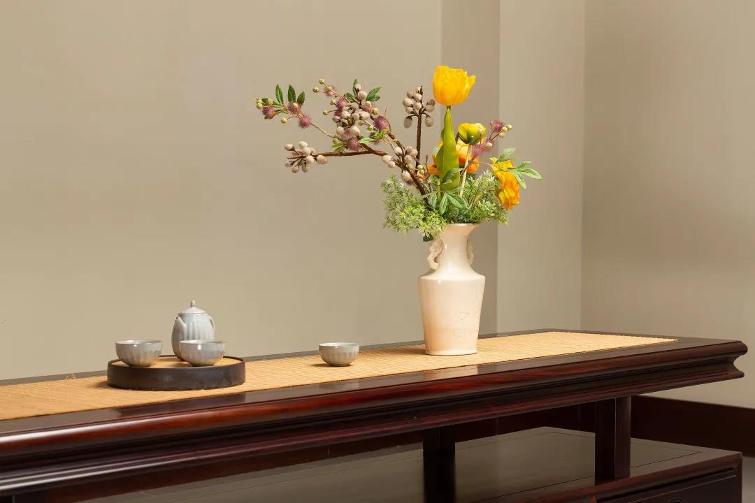 居室之内,不妨在古典家具上放置瓶花,古典家具的古朴素雅、厚重沉静,插花的轻盈灵动、自然芬芳,两者相得益彰,中式禅意油然而生。