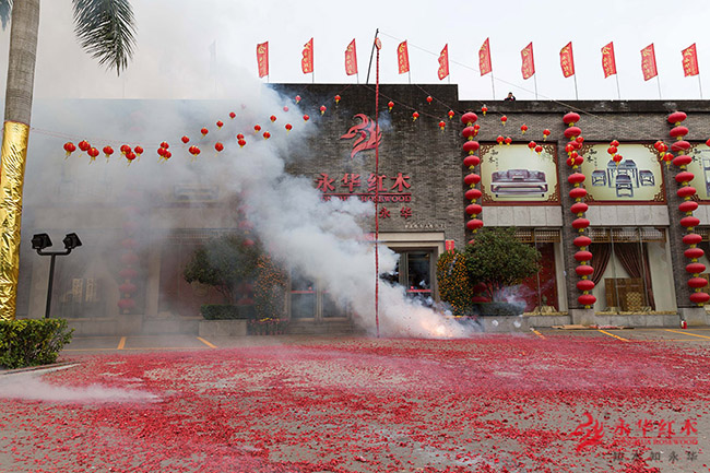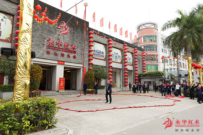清晨,永华红木总店门口已被灯笼和鞭炮装点出一片喜色,鞭炮声、祝福声奏响永华新年开工的号角!