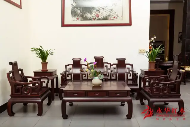 永华红木五福卷书沙发,7件套,为巴里黄檀(酸枝)制,座椅卷书式搭脑,靠背光素无雕饰,面下设束腰,内翻马蹄落地,整套沙发用料厚实,做工精细,打磨光润,放置家中,格古雅致。