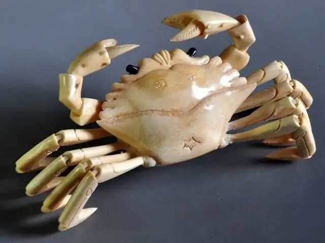 此件民国骨雕螃蟹摆件,长25厘米,重203克。色泽白中略带微黄,厚实温润,玲珑小巧,以仿生圆雕憩息河蟹形象。蟹两鳌举过头顶,八爪四张,圆睛凸起,甲壳及腹部精细雕琢,神态生动传神。