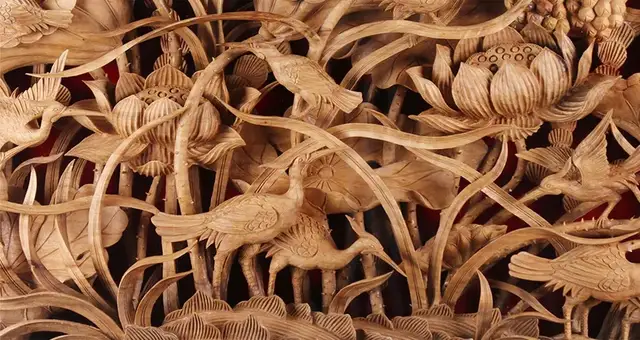 此套雕荷花罗汉床,其围屏、牙条上均深浮雕缠枝莲纹,刀工苍劲有力,逼真细腻,形态各异的荷花与莲叶,其恬淡自然的形象又能带给您别有一番的体验。