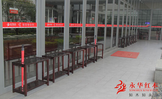 每当下雨天,永华员工的雨具不知如何放置才好,有直接扔地上的,有放在椅子上的,把到处都弄得湿哒哒的,见到如此难堪的场景。各个部门开始集思广益,有人说:直接从外面采购雨伞架,无论是材质是塑料还是不锈钢的都可以选择,但却与“凤鸣阁”风格设计极不般配。我不由自主暗想设置雨伞专区念头。一开始放雨伞桶,可容量太小,根本解决不了放置雨伞数量的困难。通过仔细的思考我大胆提出:为何不能自主研发和制作红木雨伞架呢?既能呈现红木家具的实用功能,又能与永华红木品牌相得益彰。