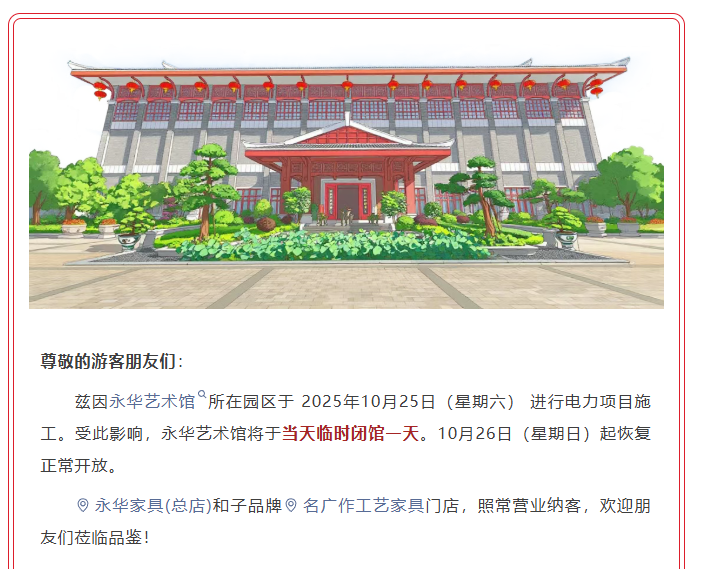 受台风“桦加沙”的影响,永华艺术馆于2025年9月23日起临时闭馆,期间暂停一切线下活动。开馆情况将另行通知。